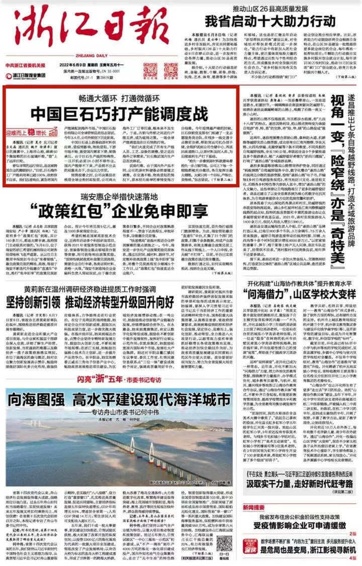 6月9日,《浙江日報》頭版頭條刊發(fā)《中國巨石巧打產(chǎn)能調(diào)度戰(zhàn)》,全文如下: