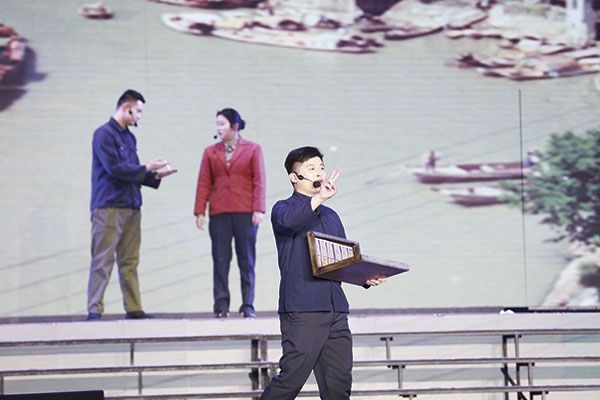 “現(xiàn)在是新聞和報紙摘要節(jié)目時間?!备挥袝r代感的廣播聲,將觀眾的思緒帶入《巨石故事》情景劇現(xiàn)場。1984年,張毓強擔任石門玻纖廠副廠長,全面主持工作。面臨著改革的轉(zhuǎn)折點,廠里職工意見各異,但張毓強堅決果敢地決定向銀行貸款120萬元,帶領(lǐng)員工搬向新廠區(qū),進行了第一次大規(guī)模技術(shù)改造。