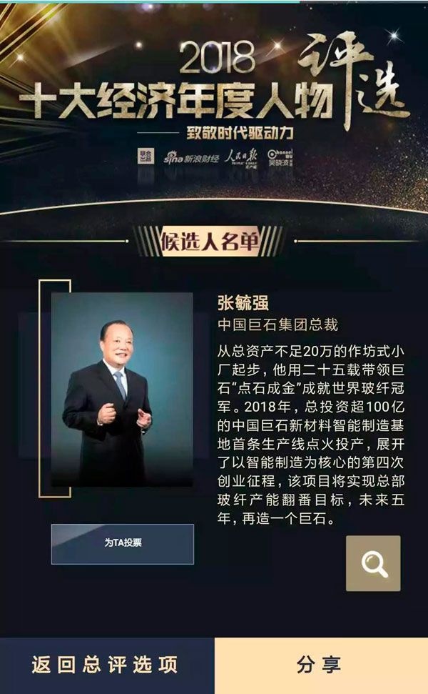 中國巨石總裁、巨石集團董事長兼CEO張毓強,與馬云、馬化騰、任正非、俞敏洪、李書福等知名經(jīng)濟人物一同入圍最終的140名網(wǎng)絡票選名單,名單還包括中國建材集團董事長宋志平、烏鎮(zhèn)景區(qū)/古北水鎮(zhèn)打造者陳向宏等。