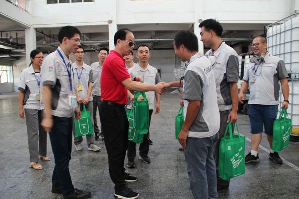 張毓強(qiáng)總裁和丁成車副總裁來(lái)到二分廠制氈工段,由于是敞開(kāi)式區(qū)域和烘箱的緣故,這里的溫度很高,工人們干活很辛苦??吹秸谡J(rèn)真干活的工人,張總關(guān)切地問(wèn):“怎么樣?熱不熱???”張總一一送上清涼禮袋,不停地說(shuō)“謝謝你們!辛苦了!”