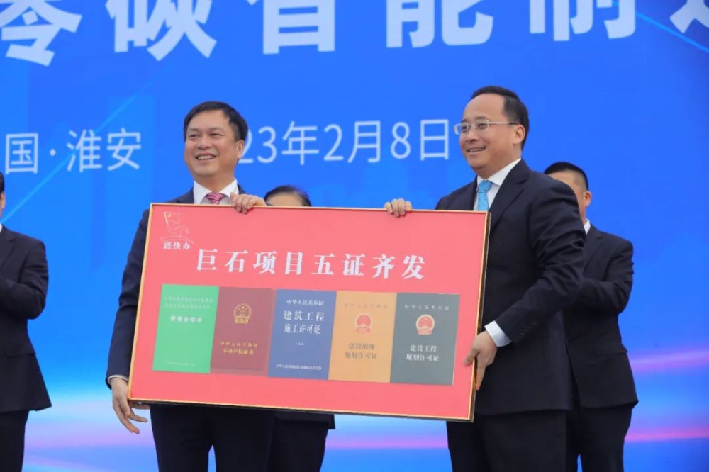 開(kāi)工儀式上,顧坤常務(wù)副市長(zhǎng)向曹國(guó)榮副總裁頒發(fā)了“五證”。