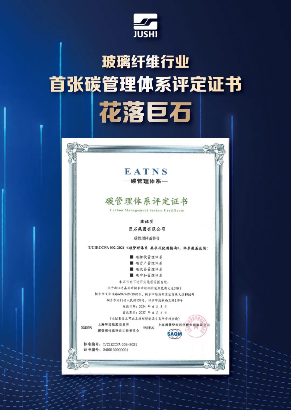 6月5日,第53個世界環(huán)境日,在上海環(huán)境能源交易所,玻璃纖維行業(yè)首張《碳管理體系評定證書》花落巨石。