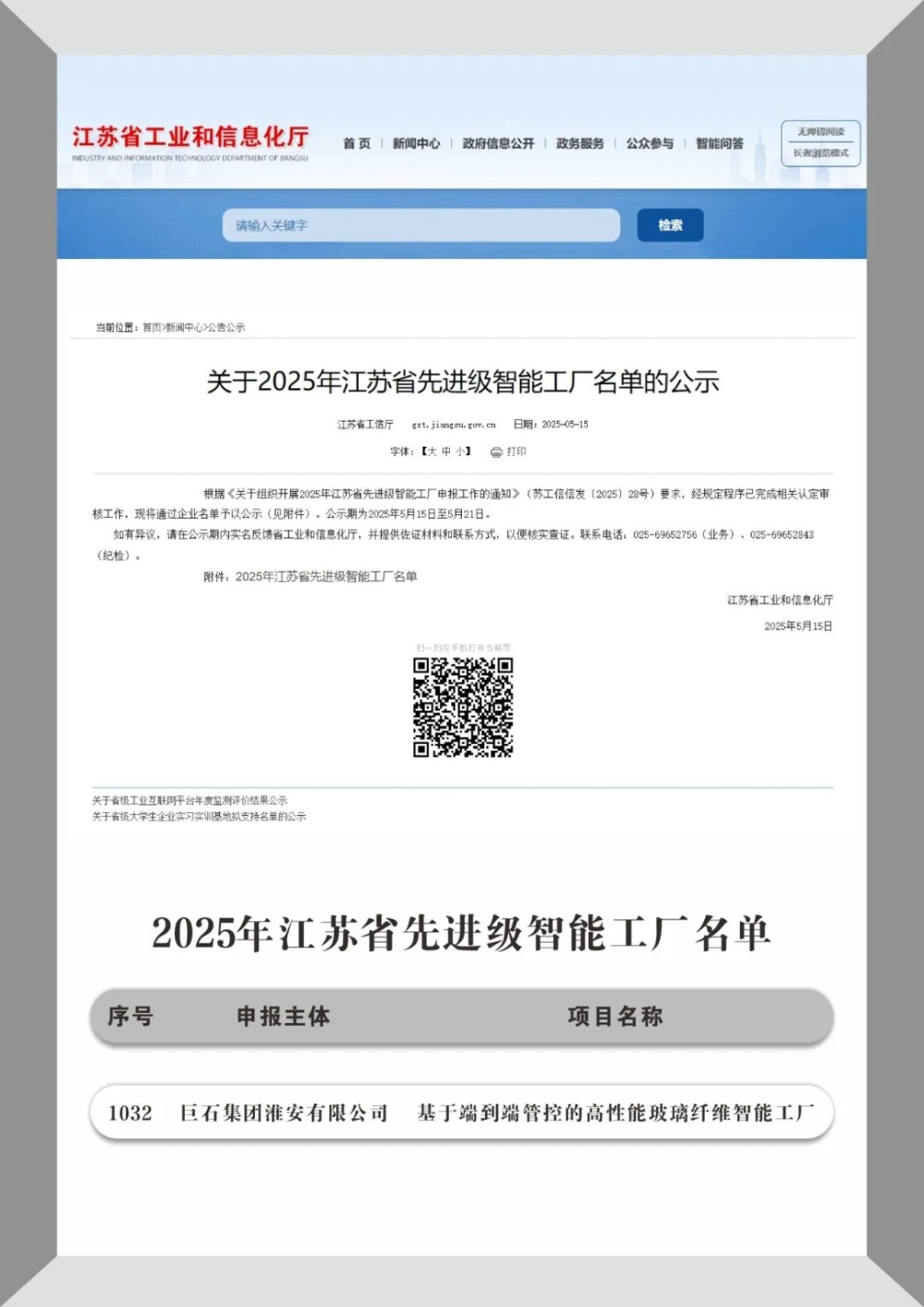 由江蘇省工業(yè)和信息化廳發(fā)布的“2025年江蘇省先進(jìn)級智能工廠名單”公示的名單中,巨石淮安公司憑借“基于端到端管控的高性能玻璃纖維智能工廠”成功入選江蘇省先進(jìn)級智能工廠。