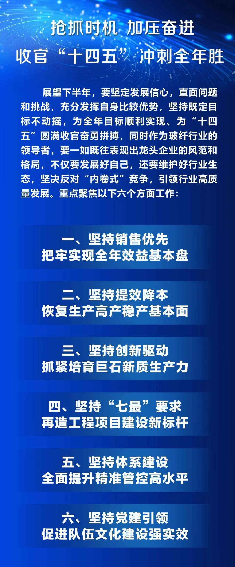 劉燕董事長在講話中充分肯定了公司上半年取得的成績,上半年巨石頂壓前行,好于預(yù)期,實現(xiàn)量價齊升,穩(wěn)的態(tài)勢提升,進(jìn)的步伐堅定,新的動能累積。他對干部員工的辛勤付出表示感謝。對于下半年的經(jīng)濟(jì)形勢和工作方向,他作出簡要分析,指出巨石要苦練內(nèi)功、補(bǔ)足短板,做最好的自己,以自身的確定性應(yīng)對外部的不確定性,全面完成年度各項目標(biāo)任務(wù),為“十五五”打好基礎(chǔ)。對此他提出了十一點要求:一是要更加注重創(chuàng)新驅(qū)動,把創(chuàng)新放在第一位;二是要更加注重結(jié)構(gòu)優(yōu)化,提高高端產(chǎn)品比例;三是要更加注重品質(zhì)提升,把產(chǎn)品質(zhì)量做成客戶口碑;四是要更加注重品牌建設(shè),實現(xiàn)價值引領(lǐng);五是要更加注重應(yīng)用開發(fā),拓寬產(chǎn)品應(yīng)用領(lǐng)域;六是要更加注重行業(yè)生態(tài),引領(lǐng)行業(yè)健康發(fā)展;七是要更加注重資本運營,把上市公司價值最大化;八是要更加注重綠色智能,保持領(lǐng)先提升競爭力;九是要更加注重和諧發(fā)展,培育ESG競爭優(yōu)勢;十是要堅守安全環(huán)保底線,安全環(huán)保是重中之重;十一是要全面加強(qiáng)黨的領(lǐng)導(dǎo)和黨的建設(shè),成為央企混合所有制黨建的典范。