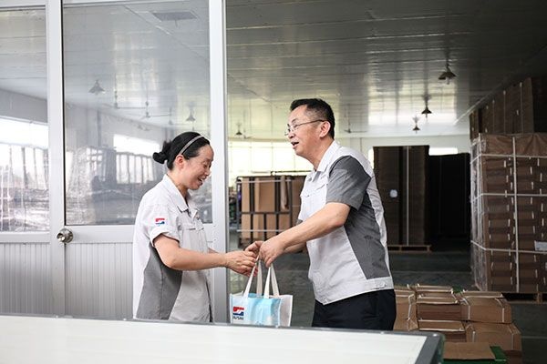 即使現(xiàn)在車間內(nèi)作業(yè)環(huán)境較從前已有較大改善,但烘箱與窯爐作為生產(chǎn)流程中的高溫環(huán)節(jié),它們不斷地“烤驗(yàn)”著員工。楊國(guó)明與曹國(guó)榮親切慰問熱情堅(jiān)守在烘箱與窯爐的員工,向他們給予最衷心的感謝和親切的慰問,為他們一一送上清涼,叮囑他們要做好高溫季節(jié)的防暑降溫工作,共同對(duì)抗高溫,保障生產(chǎn)。