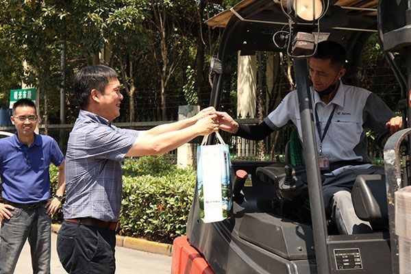在二、三分廠的發(fā)貨平臺(tái)上,叉車司機(jī)們正頂著烈日作業(yè),楊國(guó)明和曹國(guó)榮帶著滿滿的心意走上前與他們握手,為他們送去清涼慰問品,并對(duì)叉車司機(jī)們連聲說著“你們辛苦了。”