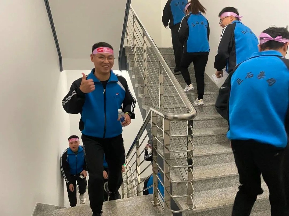 最后的登高比賽各隊選手賽出了風采、賽出了團結(jié)、賽出了激情。全面展現(xiàn)了巨石人蓬勃向上、團結(jié)奮進的精神風貌。在盤旋的樓梯上,他們奮勇爭先,健步如飛、你追我趕,對待體力稍遜一籌的女同志就攙一把、拉一下。即使心跳加速、呼吸急促,選手們沒有一個選擇半途而廢,不斷攀升的數(shù)字激勵著他們堅持一下,再堅持一下,大家相互鼓勵向著最高處進發(fā)。10樓……20樓……30樓,在中國巨石大樓的頂樓,選手們感受了一番勝利之后“會當凌絕頂,一覽‘巨石’好”的激情豪邁。