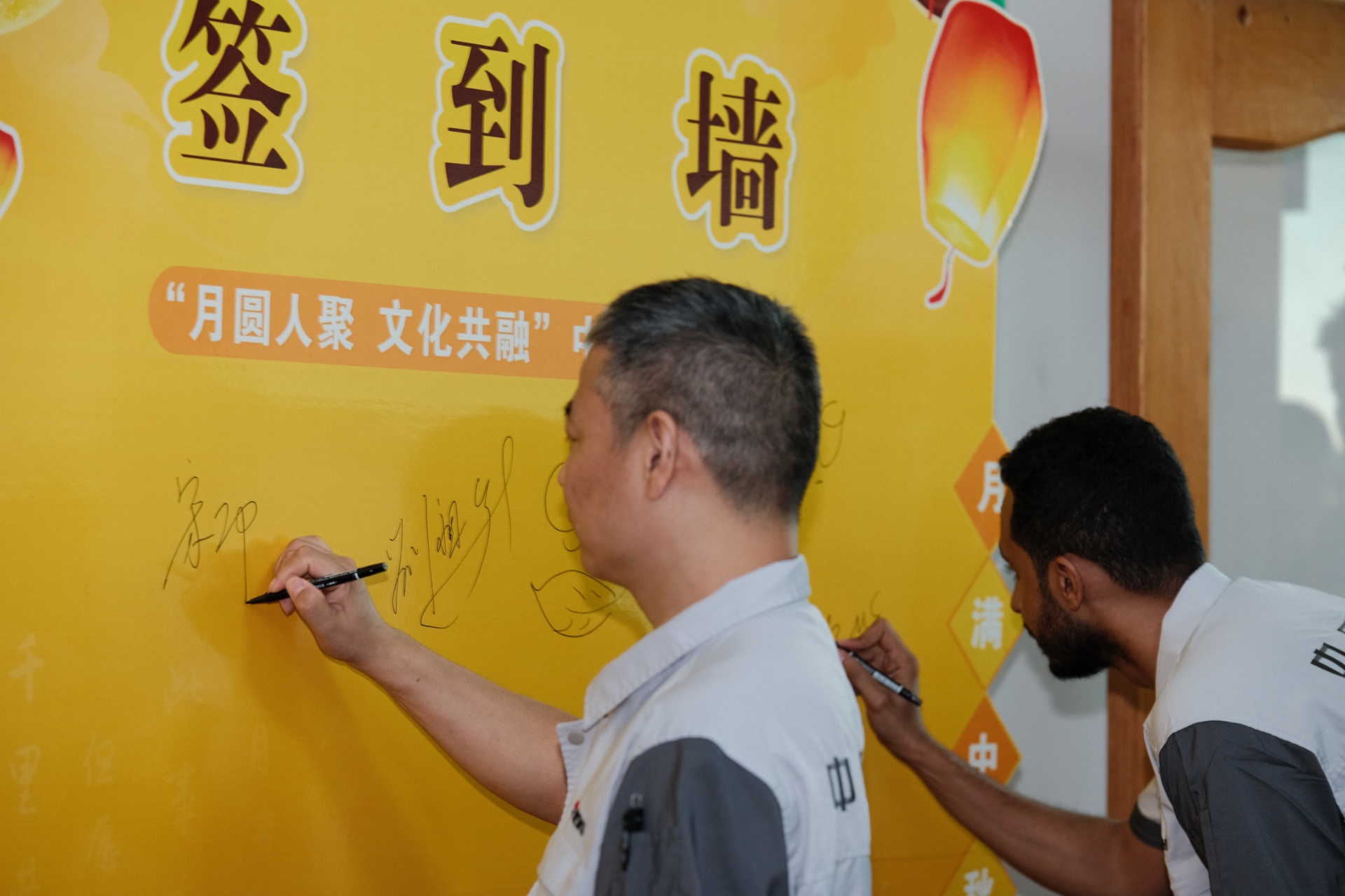 “??? ?????? ????? ?????? ????”“月滿中秋,福滿人間”“Happy Mid-Autumn Festival”中英阿三國的祝福語言交織在活動簽到墻上,形成了一幅色彩斑斕的語言畫卷,增添了節(jié)日的喜慶氛圍,展現(xiàn)文化交融的和諧之美。