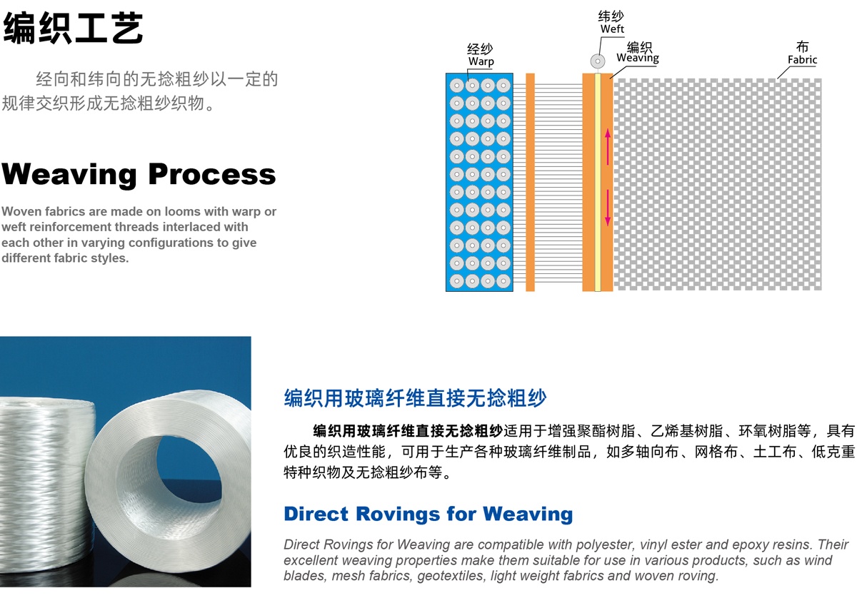 | 386H | 毛羽少,與樹脂相容性好,制品機(jī)械性能高 Low fuzz, good compatibility with resin, and high mechanical properties | 用于無捻粗紗布織造,制造管道、游艇等 Woven roving, used in pipes and boats | |