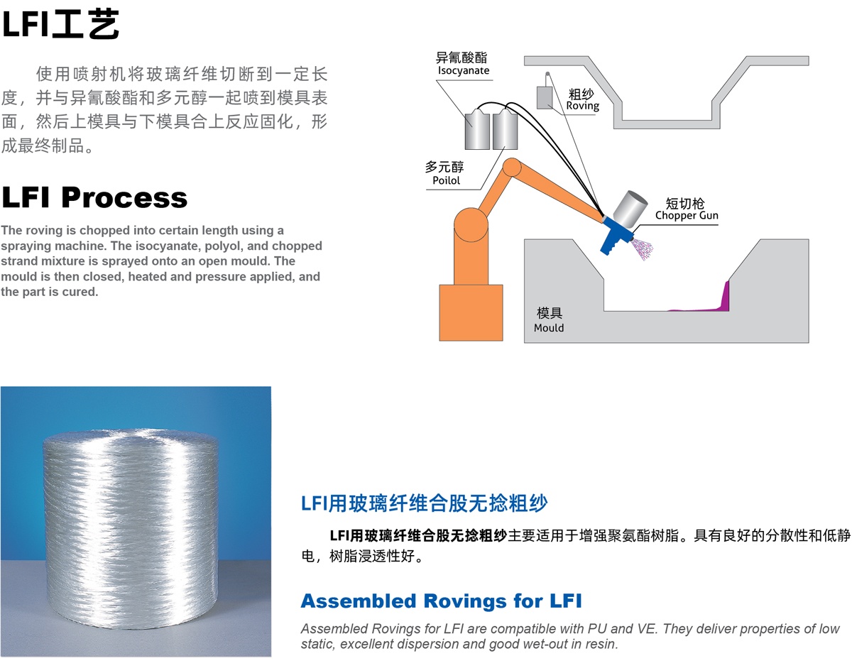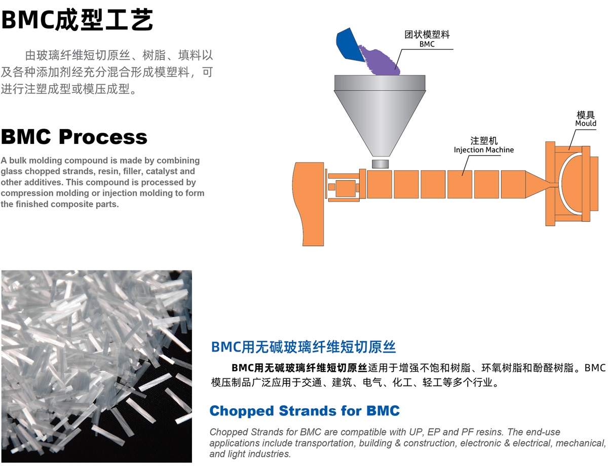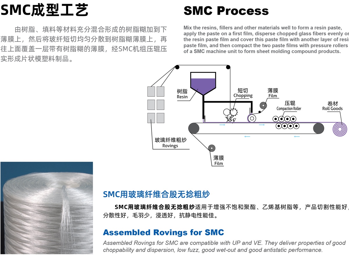 | 440 | 短切分散性好,模壓流動(dòng)性好制品機(jī)械強(qiáng)度高 Excellent choppability and dispersion, good mold flowability,high mechanical strength of composite products | 門皮、汽車部件 Door skins, automotive parts |