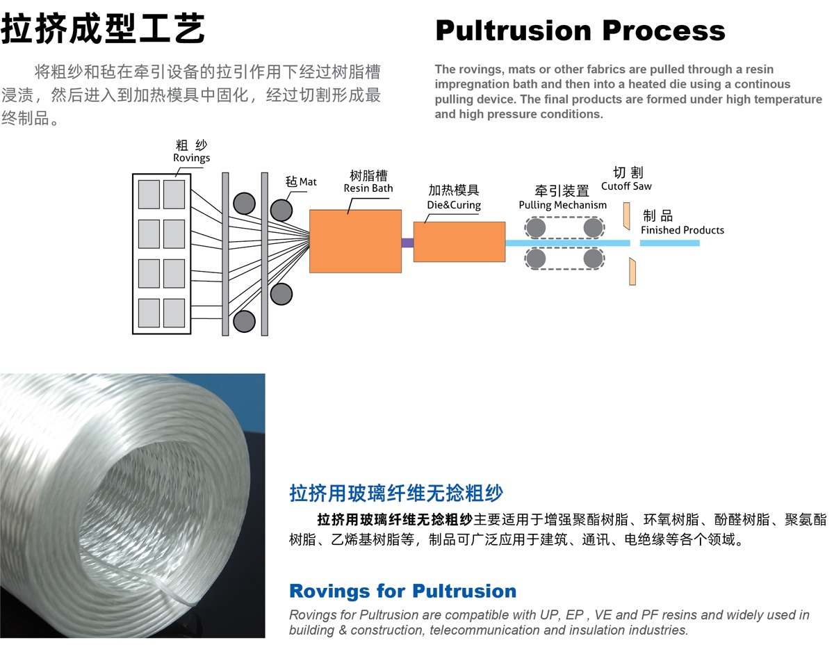 | 332 | 直接紗,毛羽少,與聚氨酯樹(shù)脂結(jié)合性好, 浸透效果佳,制品機(jī)械性能優(yōu)異 Direct roving, low fuzz, good compatibility with polyurethane resin, good wet-out, excellent mechanical properties | 各種型材,風(fēng)電大梁等 Various pultrusion profiles, telegraph pole, etc | |