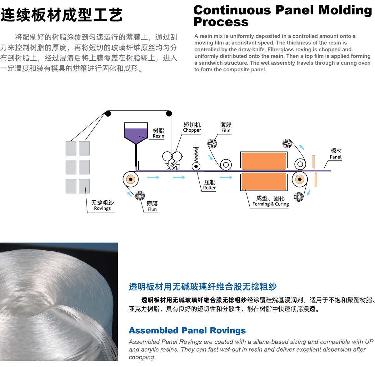 | 872 | 浸透極快,無(wú)白絲,透明度高 Extremely fast wet-out, no white fibers, superior transparency | 透明性要求苛刻的FRP板材 High transparency FRP panels | |